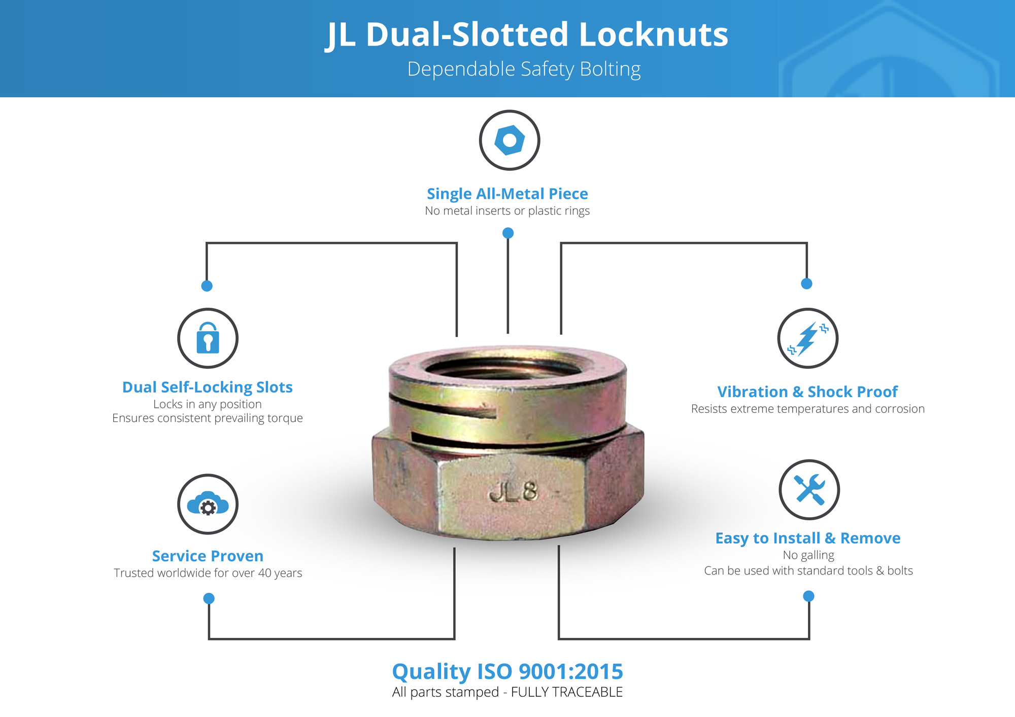J.Lanfranco dual-slotted locknuts are based on depitched rather than distorted or deformed threads. As a result, they provide highly-consistent, repeatable, and reliable self-locking torque that’s independent of bolt tension.